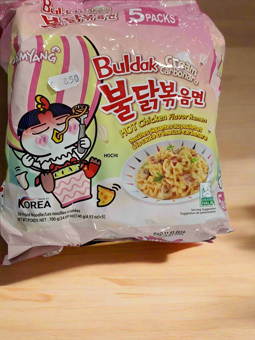 Samyang Chicken Flavor Ramen is a popular instant noodle dish known for its spicy, savory chicken flavor. The noodles are typically thick and chewy, providing a satisfying texture. This ramen is often accompanied by a rich, flavorful broth that has a kick of heat, making it a favorite among those who enjoy spicy foods. It can be enjoyed on its own or customized with additional ingredients like vegetables, eggs, or meats for an extra hearty meal.