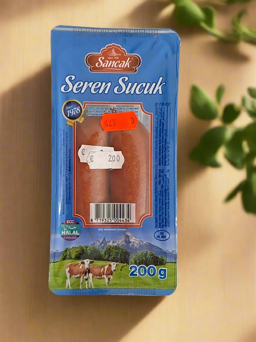 Sancak Seren Sucuk is a type of Turkish sausage known for its bold flavor and aromatic spices. Made from high-quality meat, it often includes ingredients like garlic, cumin, and paprika, giving it a distinctive taste. Sucuk is typically enjoyed grilled, fried, or added to various dishes like pizzas and stews. Its rich flavor makes it a popular choice for breakfast, served alongside eggs or in sandwiches.