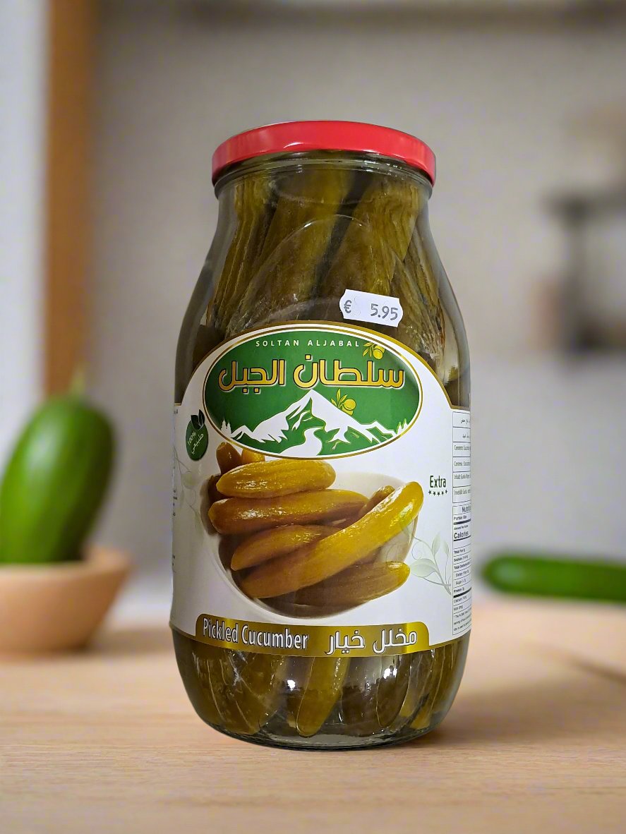 Soltan Aljabal Pickled Cucumber is a tangy and crunchy snack made from fresh cucumbers that have been pickled in a brine solution, often with spices and vinegar. These pickles are perfect for adding a zesty flavor to sandwiches, salads, or charcuterie boards. They can also be enjoyed on their own as a tasty snack. The pickling process enhances the cucumbers' natural crunch and gives them a delightful sour taste, making them a popular choice for those who enjoy savory, tangy flavors.
