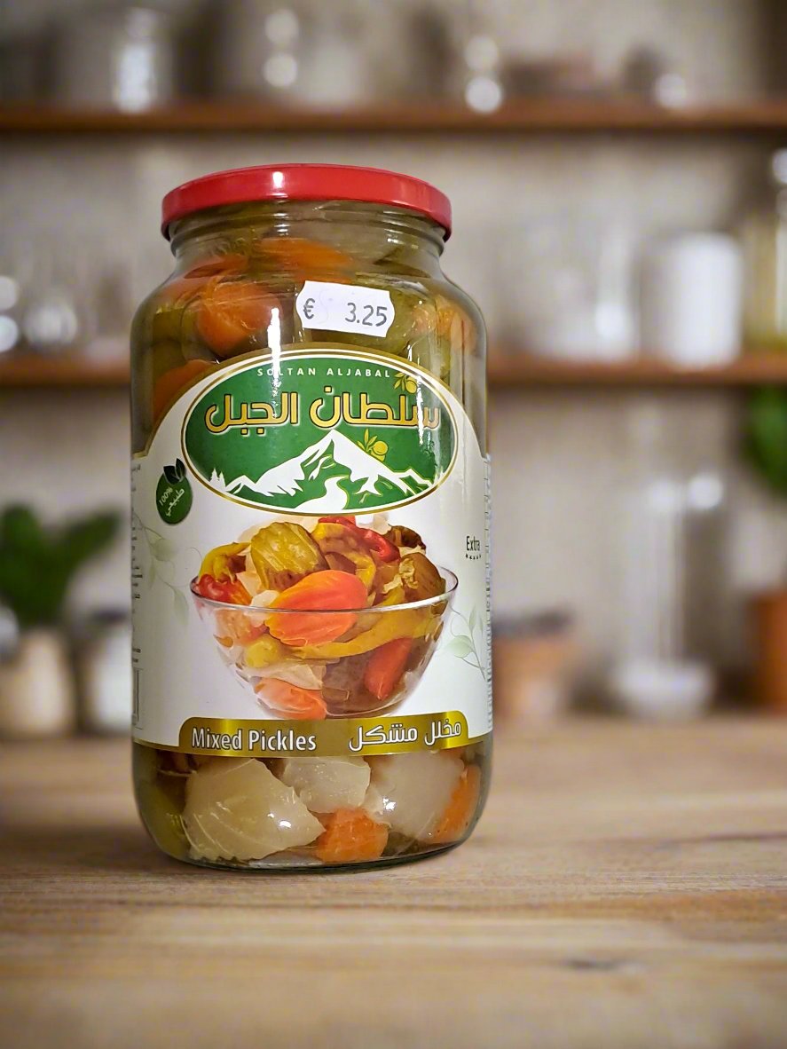 Soltan Aljabal Mixed Pickles are a flavorful assortment of various pickled vegetables, typically including cucumbers, carrots, peppers, and cauliflower, all preserved in a tangy brine. This mix offers a delightful combination of crunch and acidity, making it a perfect accompaniment to a variety of dishes. Mixed pickles are commonly enjoyed with sandwiches, grilled meats, or as part of an appetizer platter, adding a burst of flavor and a refreshing contrast to richer foods. They are a staple in many Mediterranean and Middle Eastern meals.