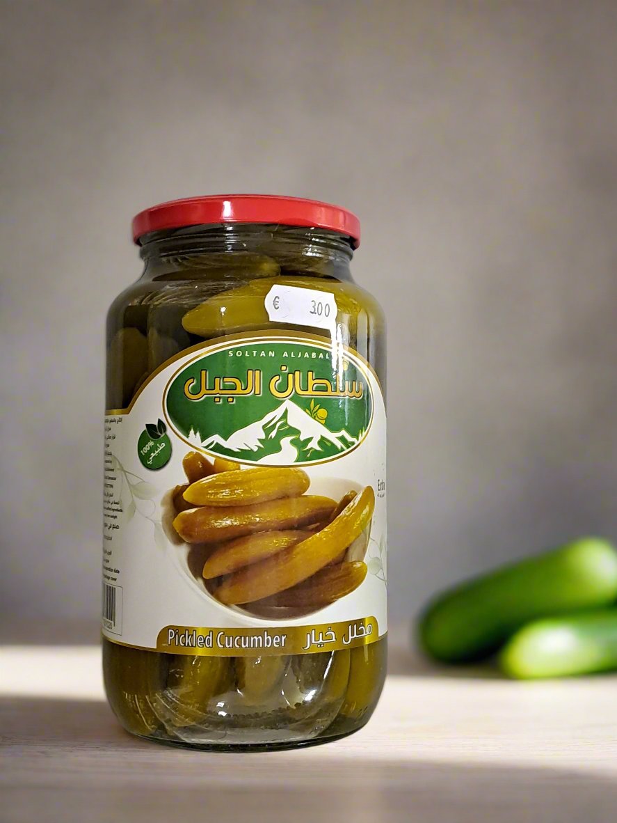 Soltan Aljabal Pickled Cucumber is a tangy and crunchy snack made from fresh cucumbers that are preserved in a brine solution, often with spices and vinegar. These pickles offer a refreshing sourness and a crisp texture, making them an excellent addition to salads, sandwiches, or as part of a mezze platter. They can also be enjoyed on their own as a delicious snack. The pickling process enhances the cucumbers' natural flavor, providing a zesty complement to a variety of dishes.