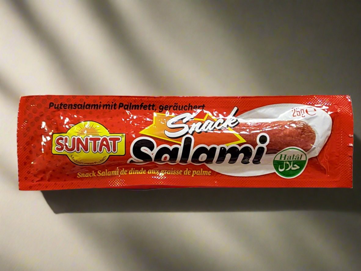 Suntat Snack Salami is a savory, ready-to-eat cured sausage made from high-quality meat, seasoned with a blend of spices for a rich and flavorful taste. These small, bite-sized salamis are perfect as a convenient snack, whether eaten on their own or paired with bread, cheese, or crackers. Ideal for on-the-go snacking, party platters, or as part of a charcuterie board, Suntat Snack Salami offers a satisfying combination of smoky, spiced flavors and a firm texture.