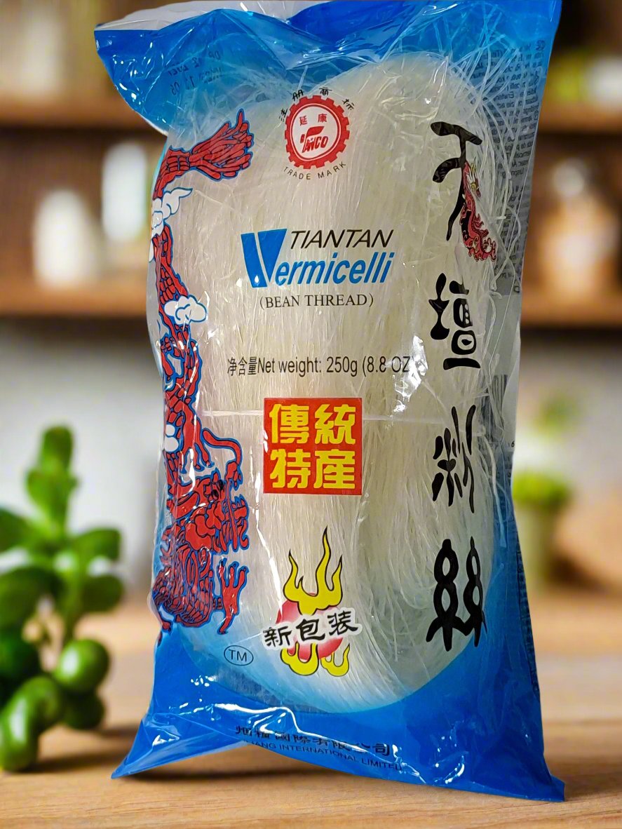 Tiantan Vermicelli (Bean Thread) is a versatile and delicate noodle made from mung bean starch. These transparent, thin strands are prized for their ability to absorb flavors while maintaining a light and chewy texture. Ideal for a variety of dishes, Tiantan Vermicelli can be used in soups, stir-fries, and salads, or as a filling for spring rolls. They are quick to cook and can be easily rehydrated in hot water, making them a convenient option for busy cooks. Enjoy the subtle taste and versatility of Tiantan Vermicelli to enhance your favorite Asian-inspired recipes.