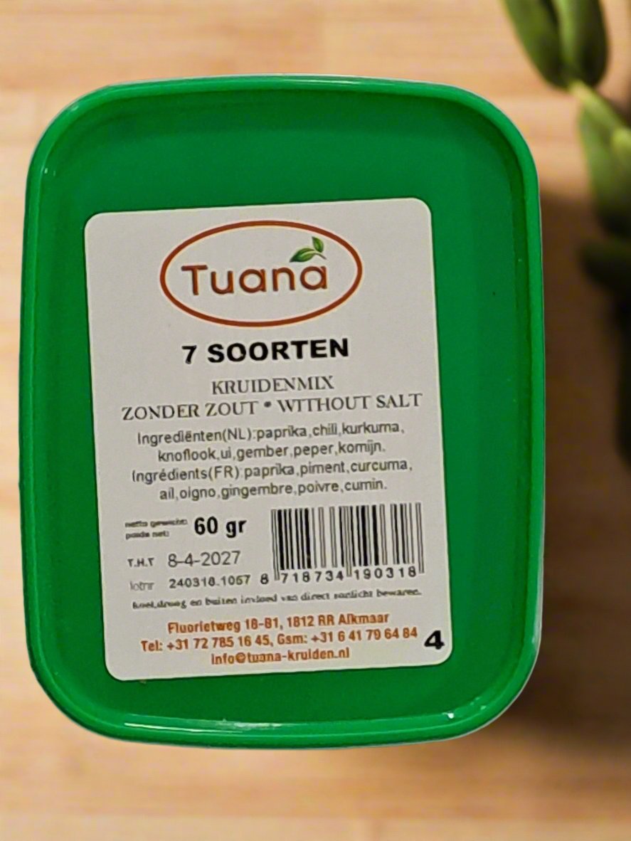 Tuana 7 Soorten Without Salt is a versatile spice blend featuring seven distinct flavors without the added sodium. This mix of herbs and spices enhances your dishes with a burst of flavor while keeping things healthy. Perfect for seasoning meats, vegetables, and more, it’s a great way to add depth and complexity to your cooking without compromising on taste or health.