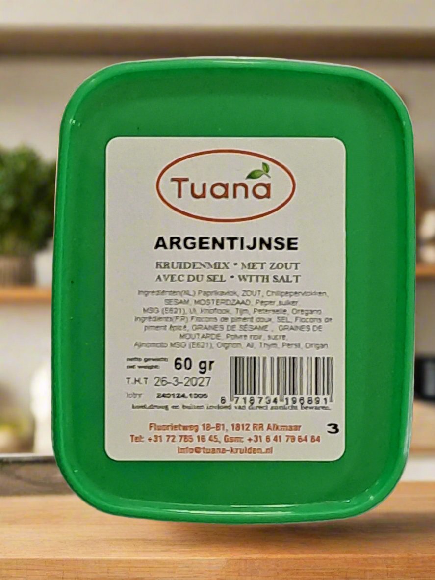 Tuana Argentijnse is a bold and flavorful spice blend inspired by Argentine cuisine. This seasoning mix captures the essence of South American grilling with a harmonious combination of herbs and spices. Perfect for enhancing steaks, chops, and vegetables, Tuana Argentijnse brings a touch of Argentine flair to your kitchen.