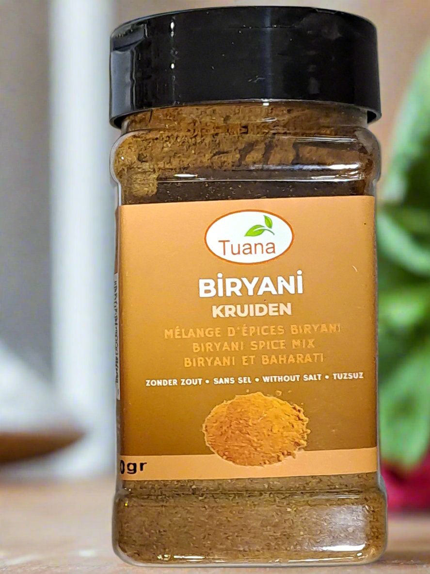 Tuana Biryani Kruiden is a spice blend specifically designed for making biryani, a popular and aromatic rice dish from South Asia. This blend typically includes a mix of spices such as cumin, coriander, turmeric, cloves, cardamom, cinnamon, and bay leaves. The combination provides a rich, warm, and complex flavor profile that complements the layers of spiced rice and meat or vegetables found in biryani. It can be used to season the rice, marinate meat, or add depth to the dish overall.