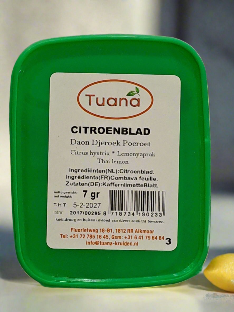 Tuana Citroenblad Daon Djeroek Poeroet is a product featuring kaffir lime leaves, known for their distinctive citrus aroma and flavor. These leaves are used in cooking to add a fragrant, tangy zest to soups, curries, and various dishes.