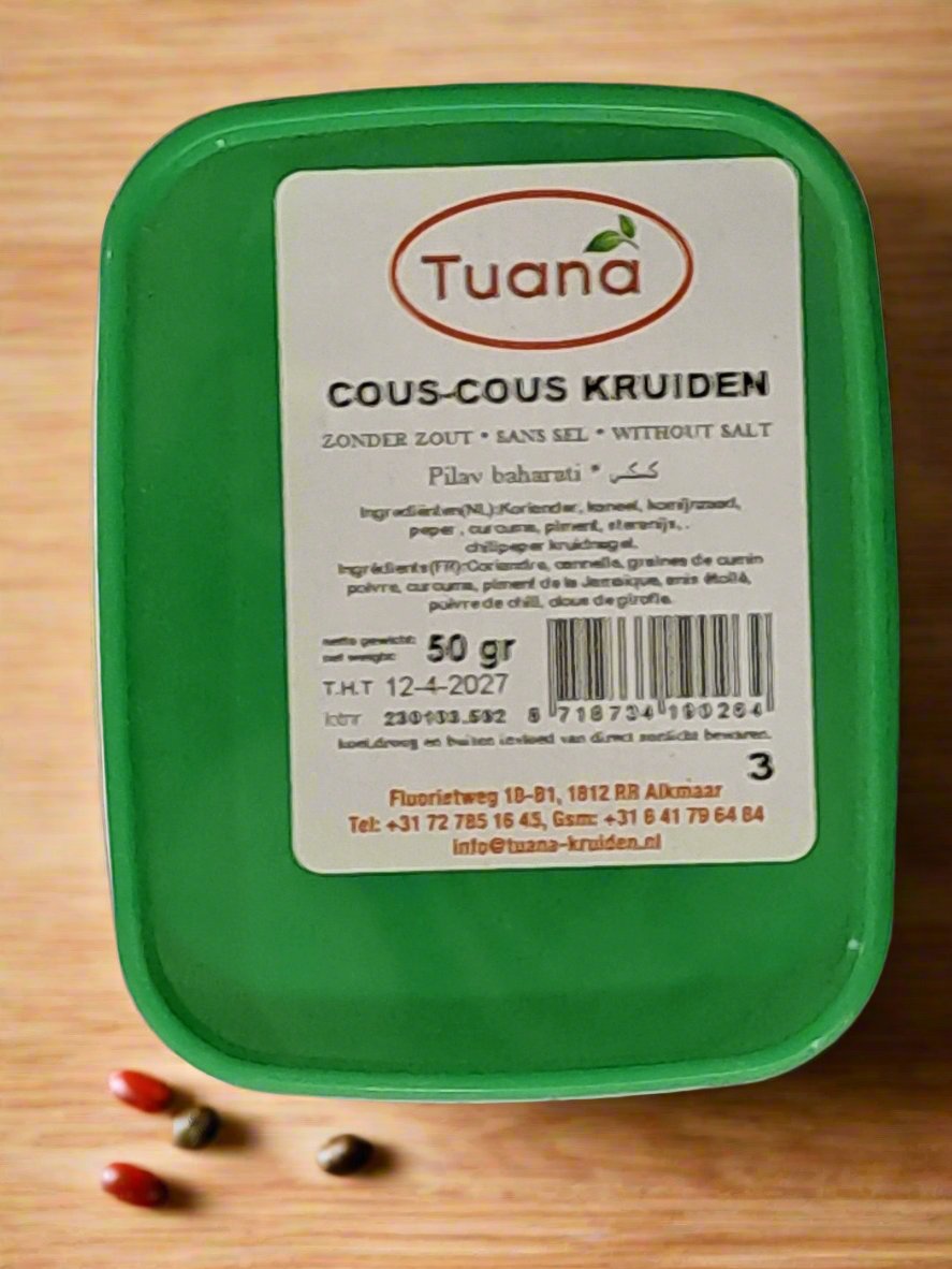 Tuana Cous-Cous Kruiden is a spice blend specifically designed for seasoning couscous. This blend typically includes a mix of aromatic spices and herbs such as cumin, coriander, paprika, garlic, and sometimes mint or parsley. It enhances the flavor of couscous, a North African dish made from steamed semolina, making it a versatile side dish or base for various main courses. The blend adds depth and complexity, making couscous more flavorful and satisfying.
