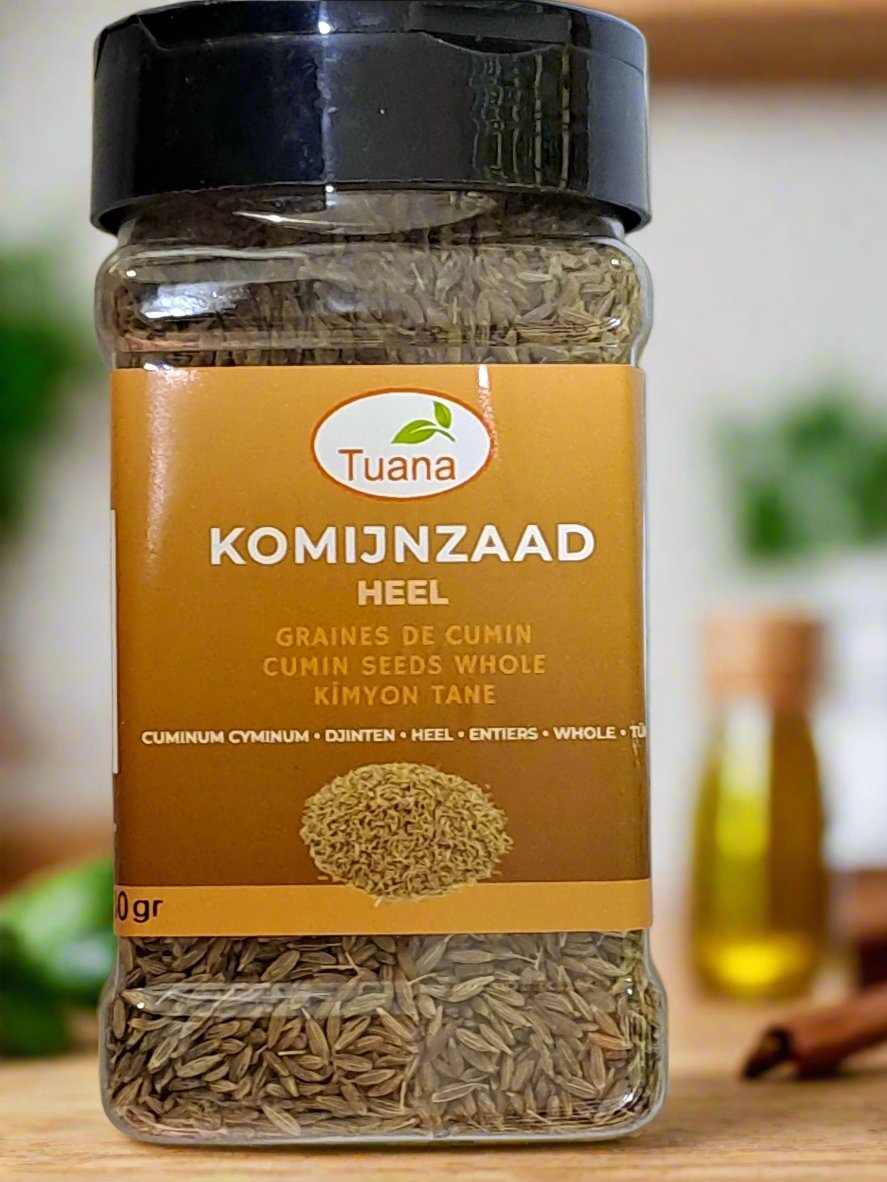 Tuana Komijnzaad Heel features whole cumin seeds known for their warm, earthy flavor and aromatic qualities. Ideal for adding depth to curries, stews, and spice blends, these seeds are perfect for toasting to enhance their natural oils and bring out a robust, slightly nutty taste. A versatile spice that enriches both savory and complex dishes.