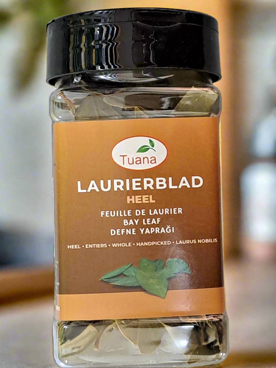 Tuana Laurierblad Heel (Whole Bay Leaves) are aromatic, dried leaves used to infuse dishes with a subtle, herbal flavor. Ideal for soups, stews, and braises, they add depth to recipes and are typically removed before serving.