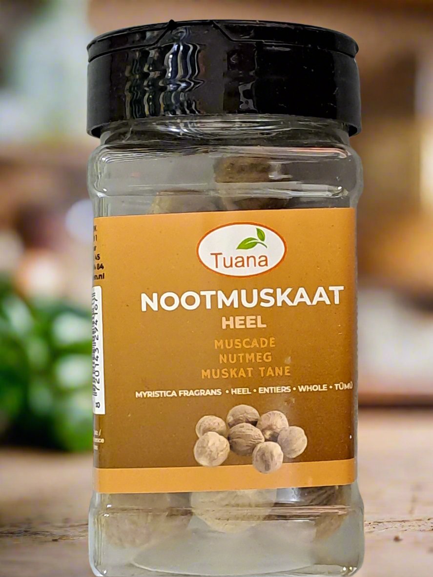 Tuana Nootmuskaat Heel (Whole Nutmeg) consists of whole nutmeg seeds that can be grated fresh as needed. It has a warm, sweet, and slightly spicy flavor, ideal for adding a rich, aromatic touch to both sweet and savory dishes. Grating it fresh releases its full, robust flavor.