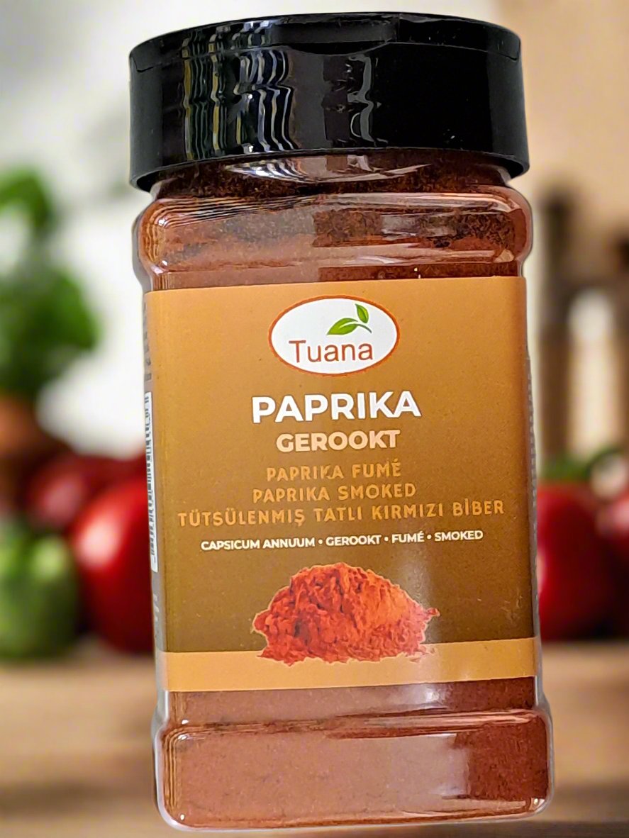 Tuana Paprika Gerookt (Smoked Paprika) is a ground spice made from dried peppers that have been smoked over wood fires. It imparts a rich, smoky flavor and vibrant red color to dishes, making it ideal for adding depth to stews, meats, and vegetable dishes.