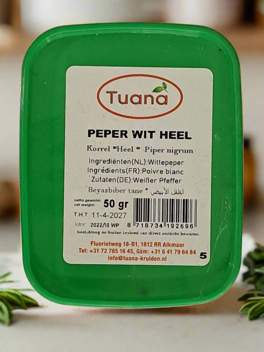Tuana Peper Wit Heel refers to whole white peppercorns. White pepper is made from the ripe seeds of the pepper plant with the outer layer removed, giving it a milder, less pungent flavor compared to black pepper. Whole white peppercorns are used in cooking to impart a subtle, earthy heat without the visual specks of black pepper. They can be ground fresh as needed to season a variety of dishes, such as light-colored sauces, soups, and seafood, where a more delicate pepper flavor is desired.