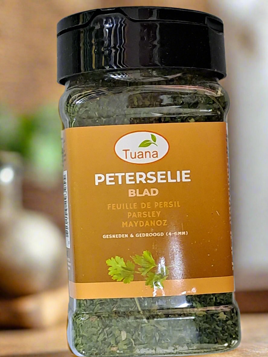 Tuana Peterselie Blad refers to dried parsley leaves. Parsley is a versatile herb known for its fresh, mild flavor and vibrant green color. Dried parsley leaves can be used as a seasoning or garnish in various dishes, including soups, stews, sauces, and salads. Although dried parsley has a less intense flavor compared to fresh parsley, it still adds a pleasant herbal note and visual appeal to recipes.