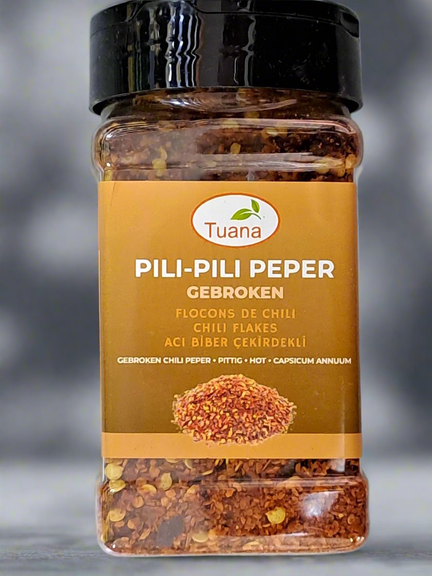 Tuana Pili-Pili Peper Gebroken (Crushed Pili-Pili Pepper) consists of finely crushed chili peppers known for their intense heat and vibrant flavor. This spicy pepper is commonly used to add a fiery kick to dishes, sauces, and marinades.