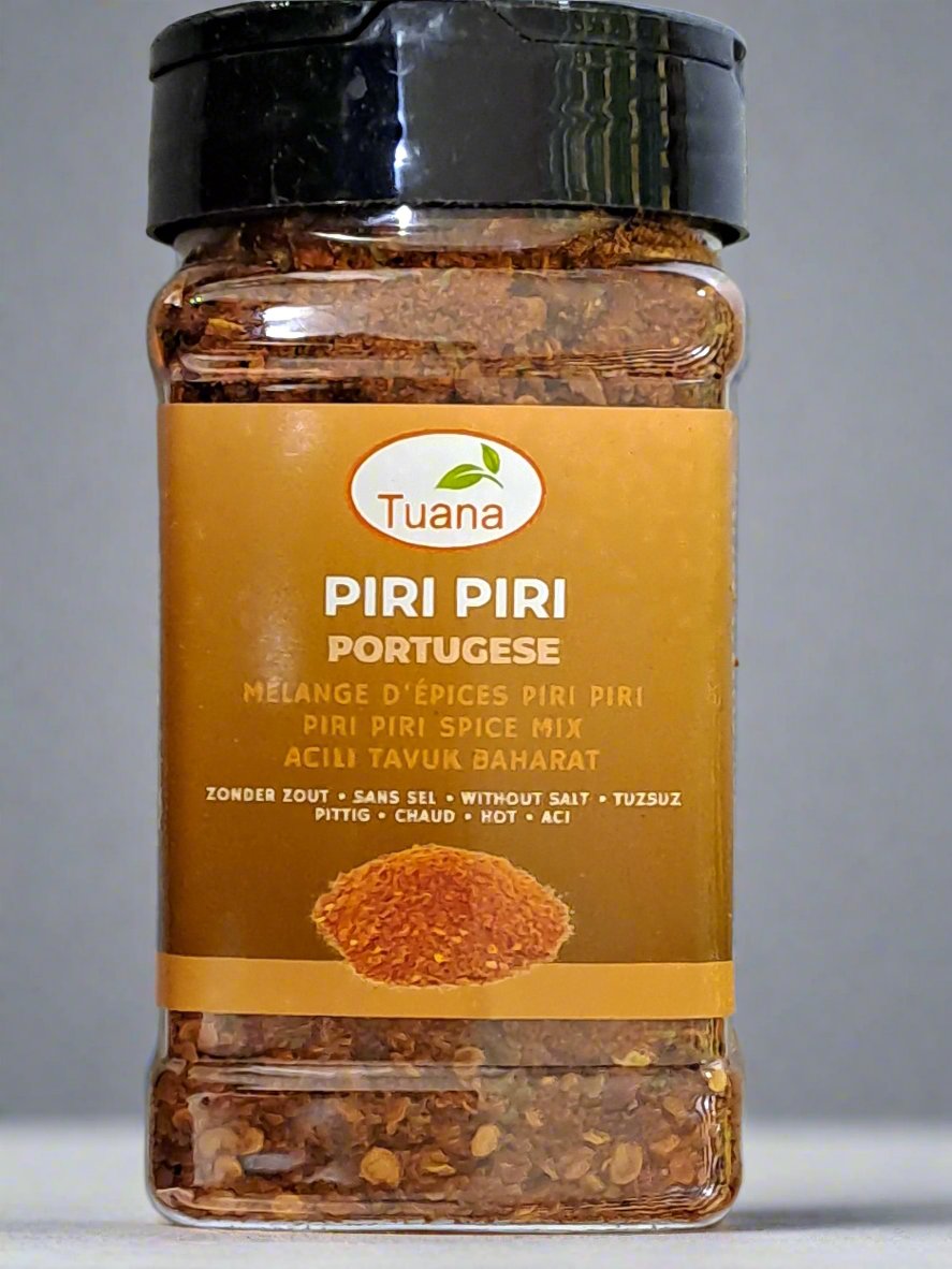 Tuana Piri Piri Portugese refers to a spicy seasoning blend known as Piri Piri. This Portuguese spice mix is typically made from dried chili peppers, garlic, lemon, and a variety of other spices such as paprika, oregano, and sometimes cumin. Piri Piri seasoning is known for its hot, tangy flavor and is often used to marinate or season chicken, seafood, and vegetables. It adds a vibrant and spicy kick to dishes, reflecting its Portuguese and African culinary roots.