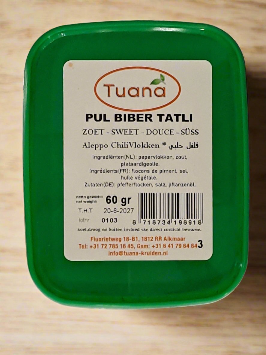 Tuana Pul Biber Tatli is a sweet variety of Turkish red pepper flakes, known for its mild heat and rich,...