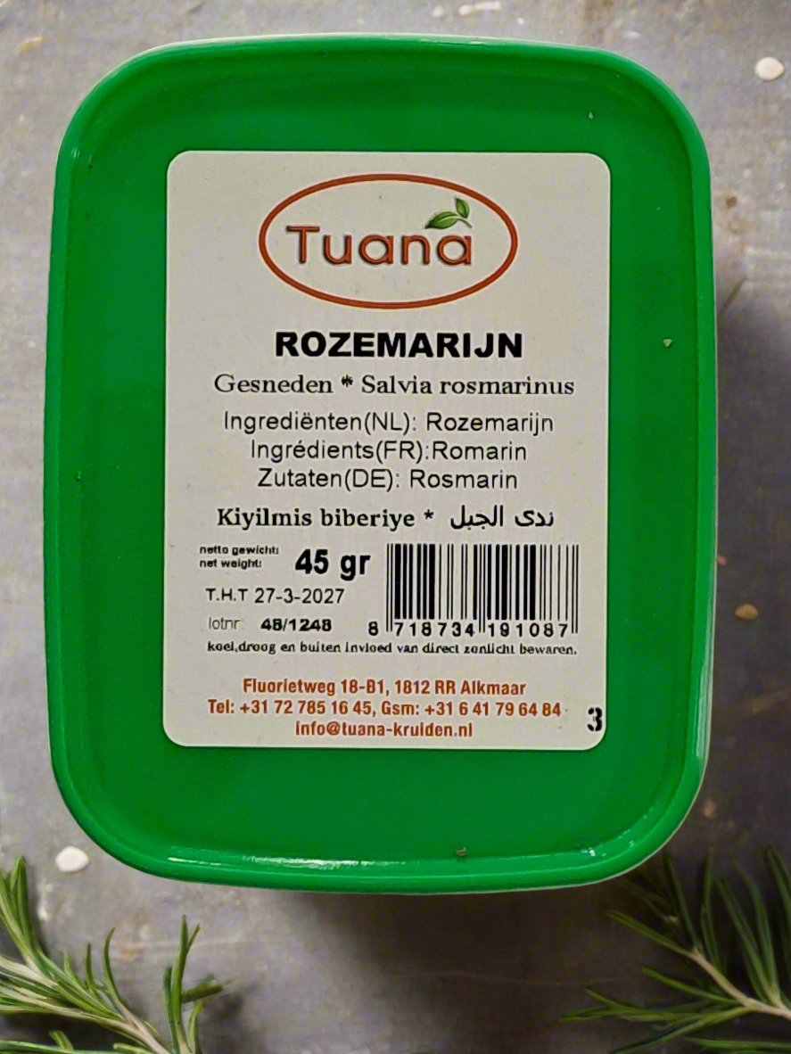 Tuana Rozemarijn refers to dried rosemary, an aromatic herb commonly used in cooking for its strong, earthy flavor. Rosemary is often added to meats, potatoes, breads, and roasted vegetables to enhance their taste. Known for its slightly pine-like fragrance and flavor, it is widely used in Mediterranean cuisine and pairs well with garlic, olive oil, and citrus. In addition to its culinary uses, rosemary has also been used in traditional herbal remedies.