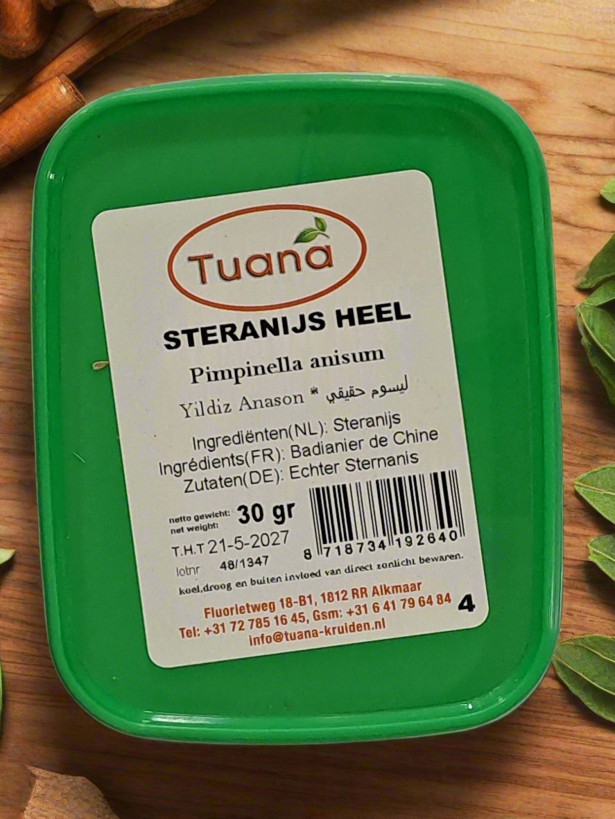 Tuana Steranijs Heel, also known as Pimpinella Anisum, is a spice derived from the seeds of the anise plant. It has a sweet, licorice-like flavor and is commonly used in cooking, baking, and herbal remedies. Anise seeds are known for their aromatic qualities and are often used in liqueurs, confections, and traditional dishes.