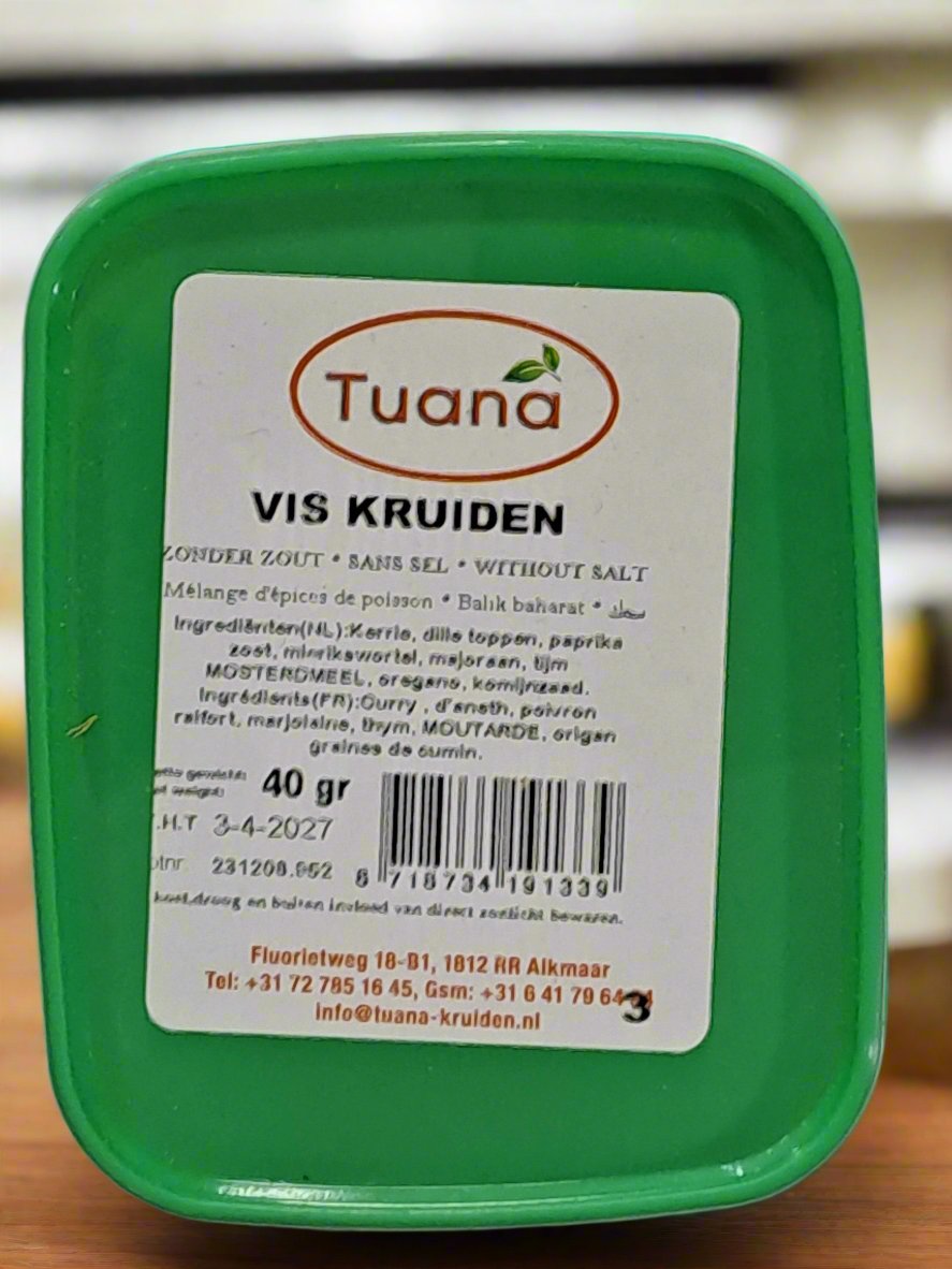 Tuana Vis Kruiden is a seasoning blend specifically designed for enhancing the flavor of fish dishes. This blend typically includes a mix of herbs and spices such as dill, parsley, lemon zest, garlic, and sometimes paprika or black pepper. The combination is crafted to complement the delicate taste of fish, adding a fresh, aromatic, and slightly tangy flavor. It can be used as a marinade, rub, or seasoning during cooking to elevate the taste of various fish and seafood recipes.