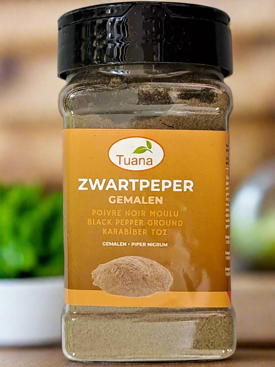 Tuana Zwartpeper Gemalen (Ground Black Pepper) is finely powdered black pepper that adds a sharp, pungent heat and a rich, spicy flavor to a variety of dishes. It is a versatile seasoning used in countless recipes, from savory to spicy, enhancing the overall taste and depth of your meals.
