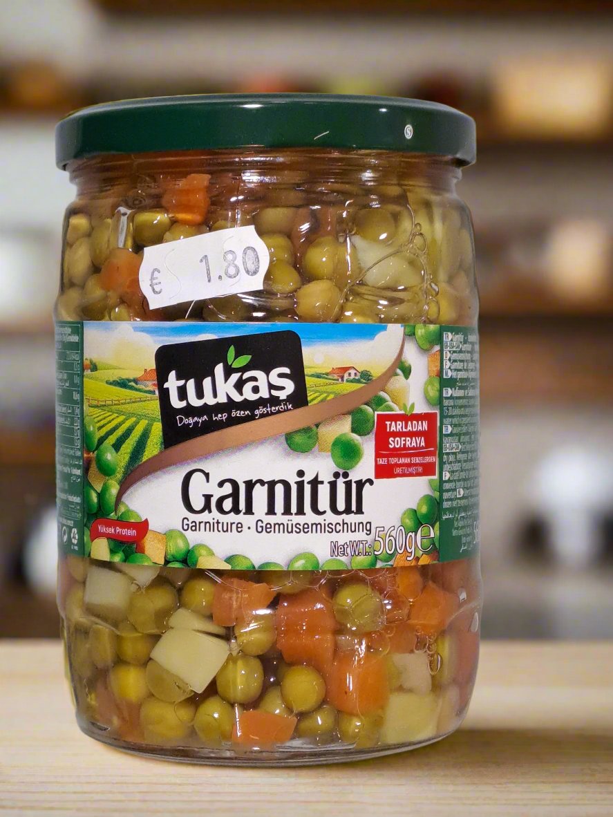 Tukas Garnitür is a convenient mixed vegetable product often used in Turkish cuisine. Typically containing a blend of vegetables such as carrots, peas, and corn, it's perfect for adding flavor and nutrition to various dishes. Ideal for soups, stews, or as a side dish, Tukas Garnitür saves time in meal preparation while providing a colorful and tasty addition to your meals. Enjoy the ease of incorporating these vegetables into your cooking!