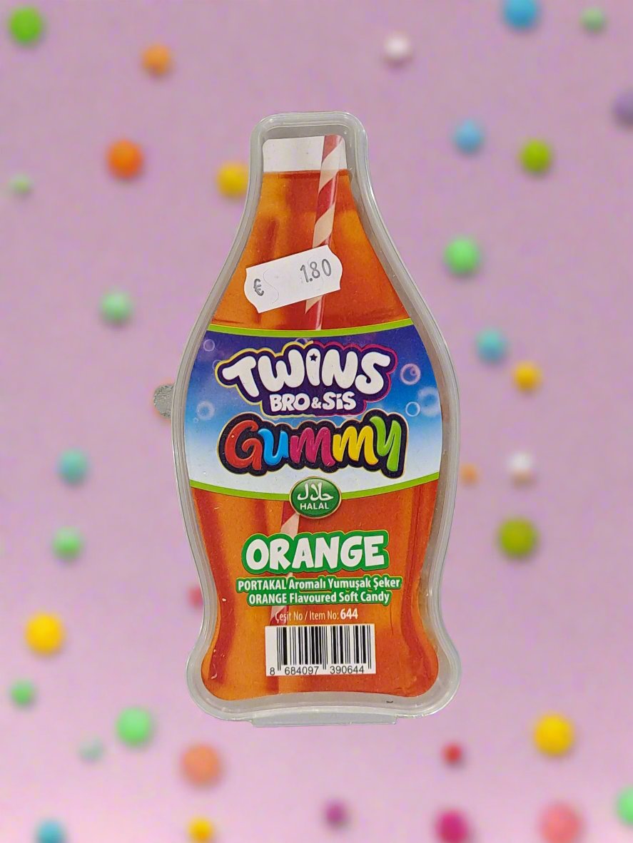 Twins Bros & Sis Gummy Orange are chewy candies shaped like orange slices, delivering a vibrant and fruity orange flavor. They offer a sweet, tangy taste with a delightful gummy texture for a refreshing snack.